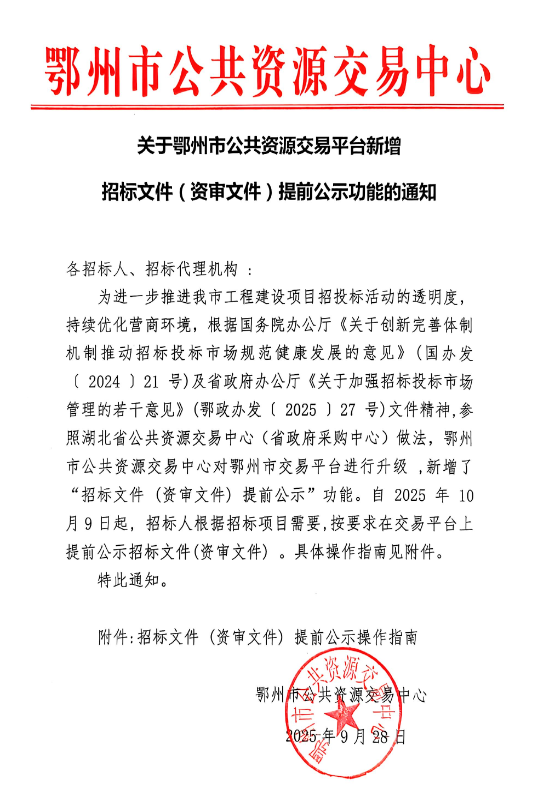 关于鄂州市公共资源交易平台新增招标文件(资审文件)提前公示功能的通知